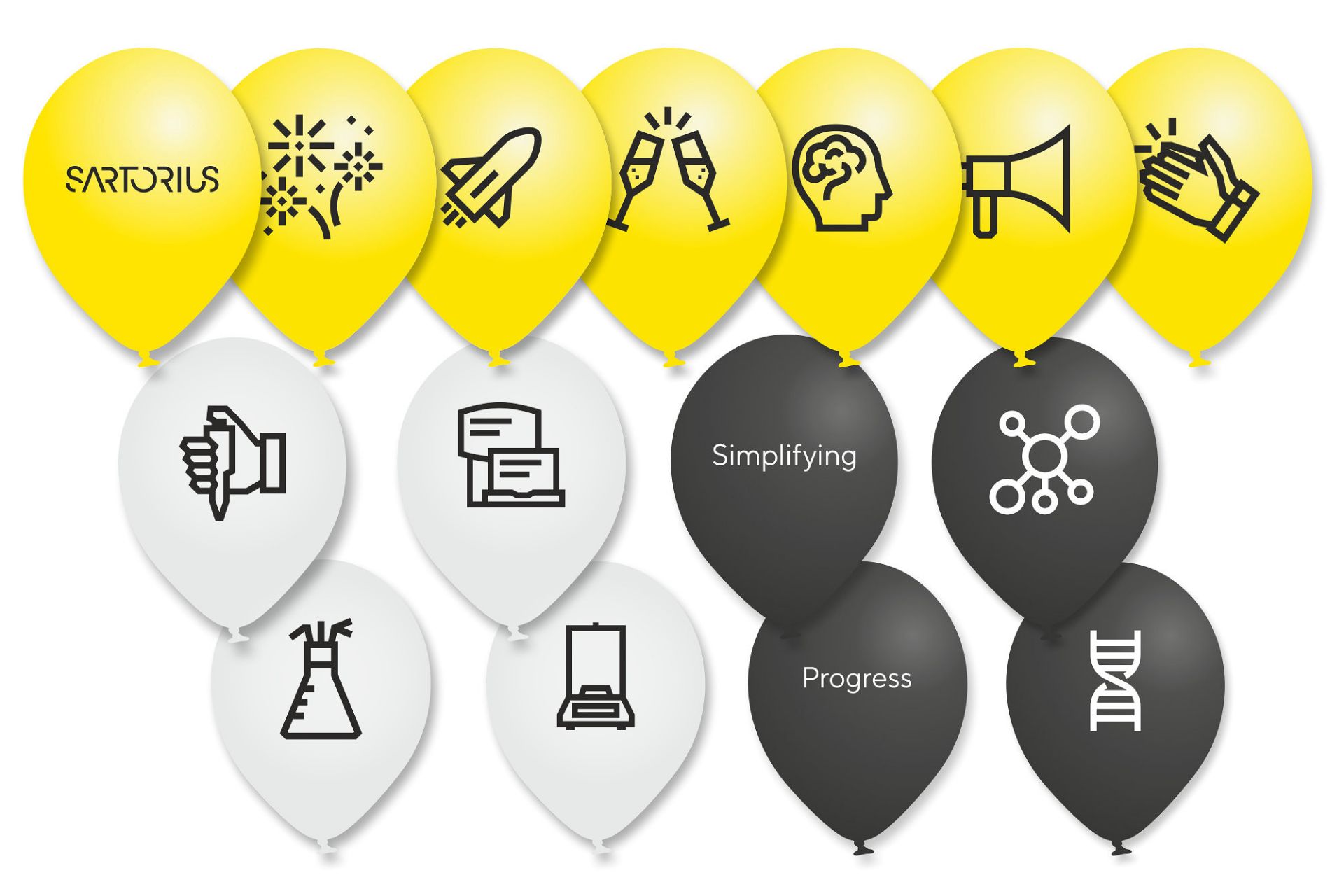 Aufteilung : 10 Motive à 5 Stück, 30 gelbe, 10 weiße und 10 schwarze Ballons.